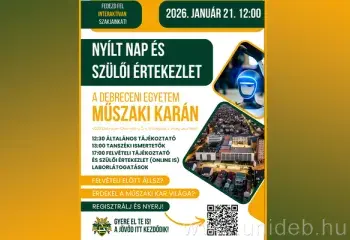 A műszaki területek iránt érdeklődő középiskolásokat, szüleiket és továbbtanulni vágyó felnőtteket várnak január 21-én, szerdán a Debreceni Egyetem Műszaki Karának Nyílt napjára és szülői értekezletére. A rendezvényen nemcsak az oktatás részleteit, hanem többek között a laborokat és az intézmény kollégiumát is meg lehet ismerni.